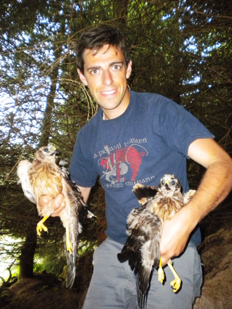An early start saw one of the greatest days ever with Hen Harriers. By 0600hrs, two young healthy female chicks were expertly fitted with lightweight MWT satellite tags. Local school children named them Heather and Sally (after two of the most important habitats for Hen Harriers). Heather can be seen on the right of the photo and her slightly older sister Sally on the left of the photo. The original post about this great day can be found by clicking here